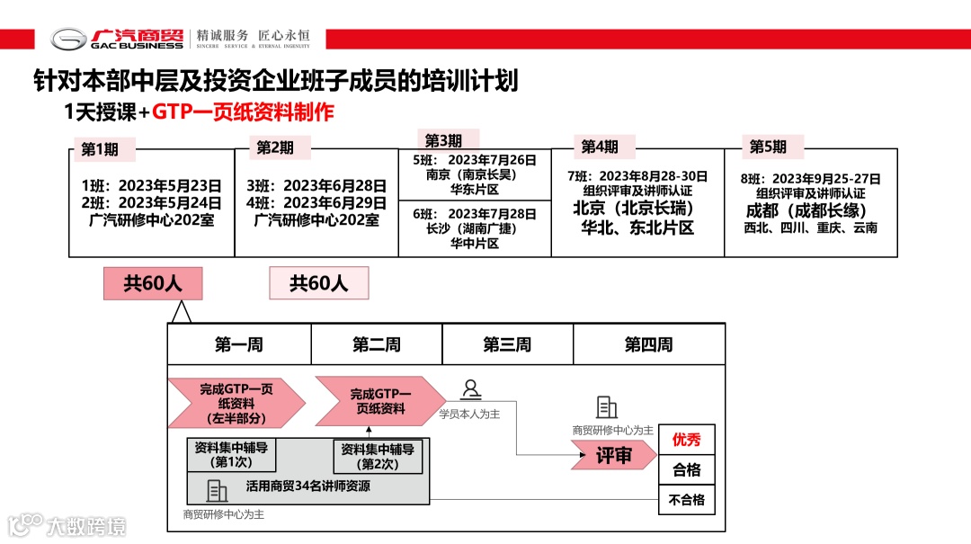 广汽商贸研修中心将于6月底至9月底,邀请集团内广汽工作方式讲师,分别在广州、南京、长沙、北京、成都面向本部中层及投资企业班子成员,举办6期培训班,并随后展开评审及讲师培养工作。其中,北京班及成都班将充分利用本地区的集团认证讲师资源展开灵活教学,已于6月6日前将资料及教学视频发放至每位学员,进入个人资料制作及资料辅导的阶段。将于8月28-30日在北京,9月25-27日在成都分别开展华北、东北、西北、四川、重庆、云南片区投资企业班子成员的个人GTP一页纸资料评审及讲师评审工作。