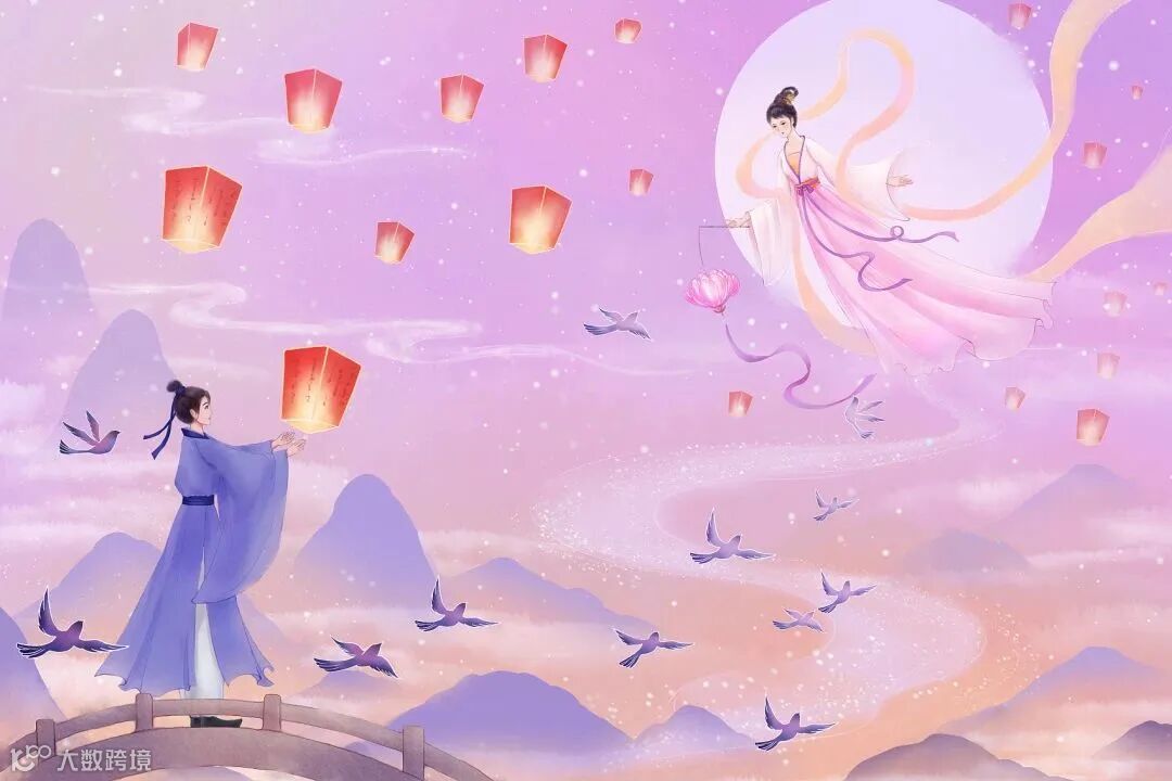 明月之下,女子朝着皎洁无暇的织女星和牵牛星,祈求自己得到一段美满幸福的姻缘。