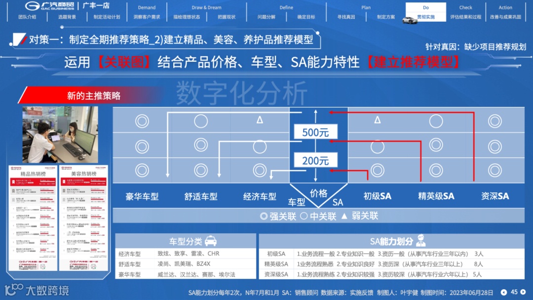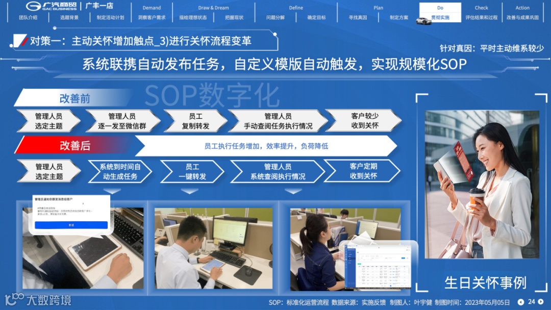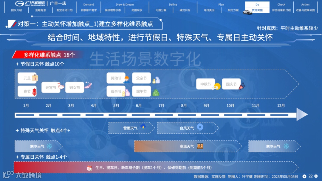 首先小组成员通过结合时间、地域特性,增加节假日、特殊天气、专属日主动关怀触点;其次对“人、货、场”进行融合,搭建运营体系,开展分层分类精准招徕,提升招徕入库率;接着,围绕客户车辆全生命周期,结合客户需求,拟定主推产品策略;同时,打造个性化的服务模式,为客户提供更专业、更细致、更便捷的服务;从生活场景、产品的数字化到数字化分析、数字化管理,以客户为中心,提高客户满意度。综上措施,小组成员经过6个月的持续改善,招徕入库率和增值产品成功推荐系数有所提升,实现了售后总产值目标,达成率为103%!