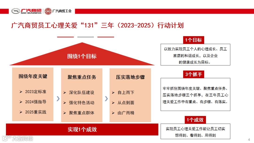 总结过去是为了更好的开启未来,会上,广汽商贸工会副主席郭晓璐发布了商贸员工心理关爱“131”三年(2023-2025)行动计划,为下一个三年商贸心理关爱工作开启了新的篇章。