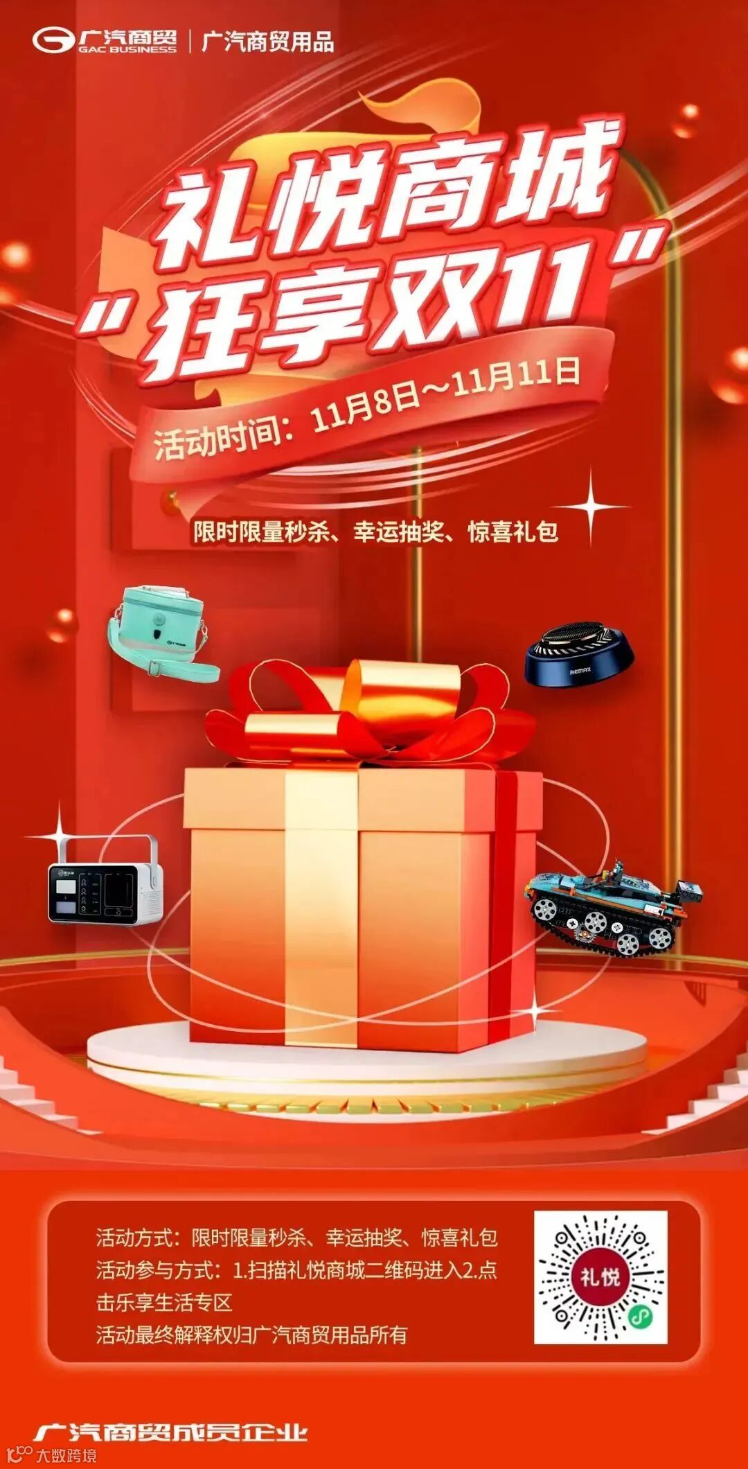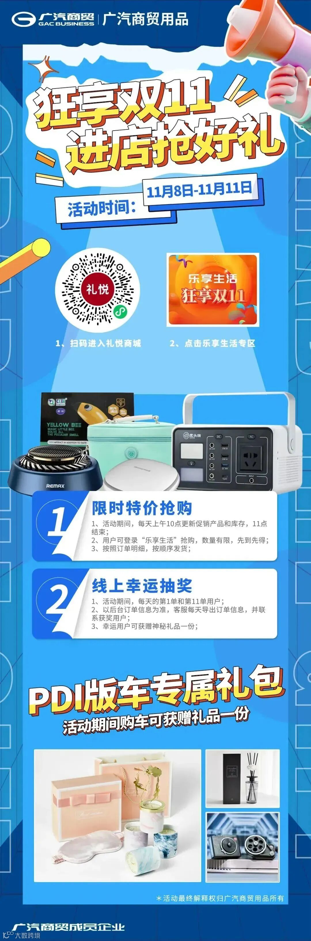 为更好赋能广汽商贸销售店、促进PDI版车销售,广汽商贸用品利用双11契机,联动广州区域商贸本田店推出“惊喜购车”方案,凡在广州区域商贸本田店购买PDI版车的用户,通过扫描二维码均可参与礼悦商城“狂享双11”活动,通过活动参与获得三大惊喜: