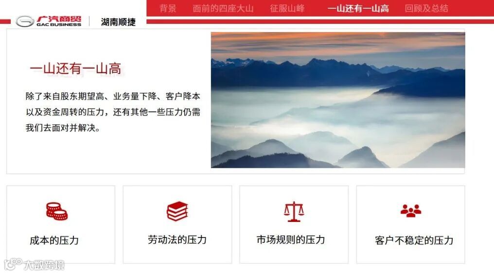 近年汽车市场整体下滑,在广汽集团、广汽商贸针对物流领域企业均多次强调,要“走出去”,提升物流企业的市场竞争力的大背景下。湖南顺捷面对四座“大山”,积极探索应对策略,努力提升市场竞争力。