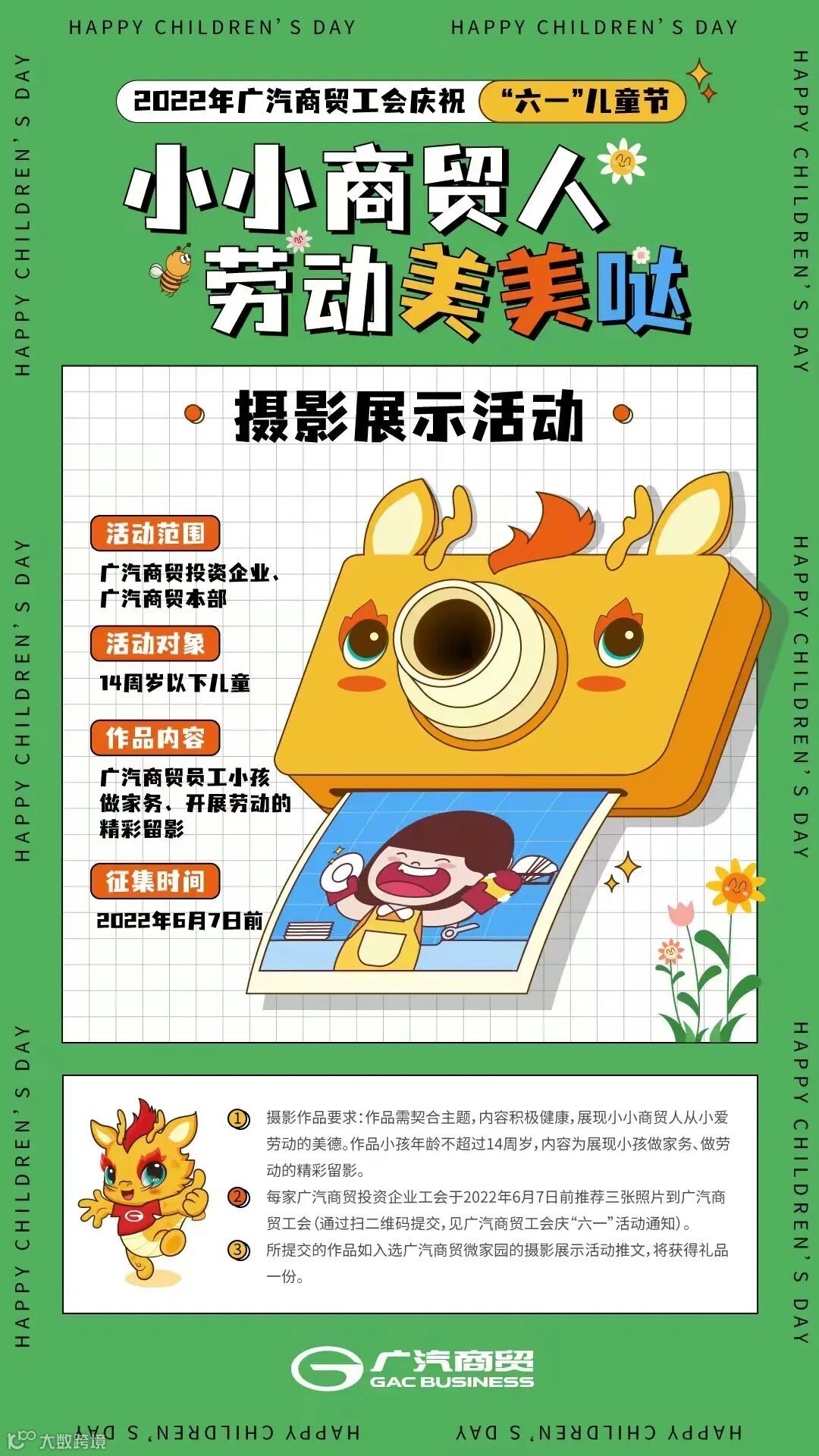 为了萌发小小商贸人热爱劳动的情感,懂得尊重劳动者,以劳动为荣,弘扬孩子从小热爱劳动的美德,广汽商贸工会举办2022年庆祝“六一”儿童节“小小商贸人劳动美美哒“摄影展示活动,展现小小商贸人从小爱劳动的美德!