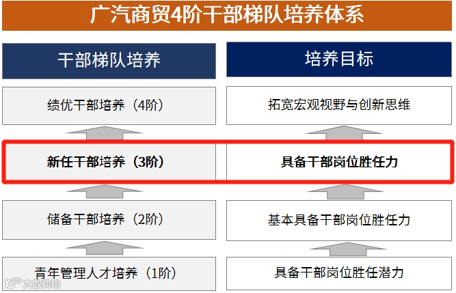 新任干部培训班是广汽商贸4阶干部梯队培养体系中的第3阶,培训对象为新任职1-3年的干部(1年≤新任职<3年)。通过提炼新任干部在任职管理中存在的共性需求,设置系列学习主题,提高岗位胜任力。