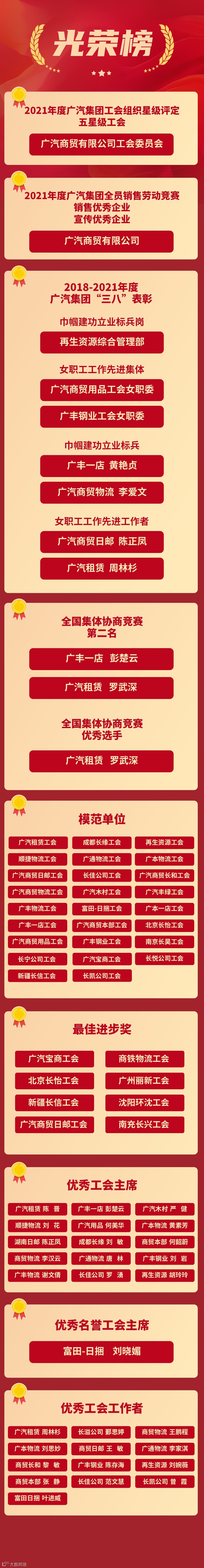 2021年度,在公司党委及上级工会的领导和支持下,广汽商贸工会取得了多项荣誉,会议通报了2021年度广汽商贸工会在上级工会中获得的各项荣誉,并对2021年度广汽商贸工会工作先进集体及个人进行表彰,授予年度模范工会、最佳进步工会、优秀工会主席以及优秀工会工作者等荣誉,以发挥先进典型的激励和示范作用。
