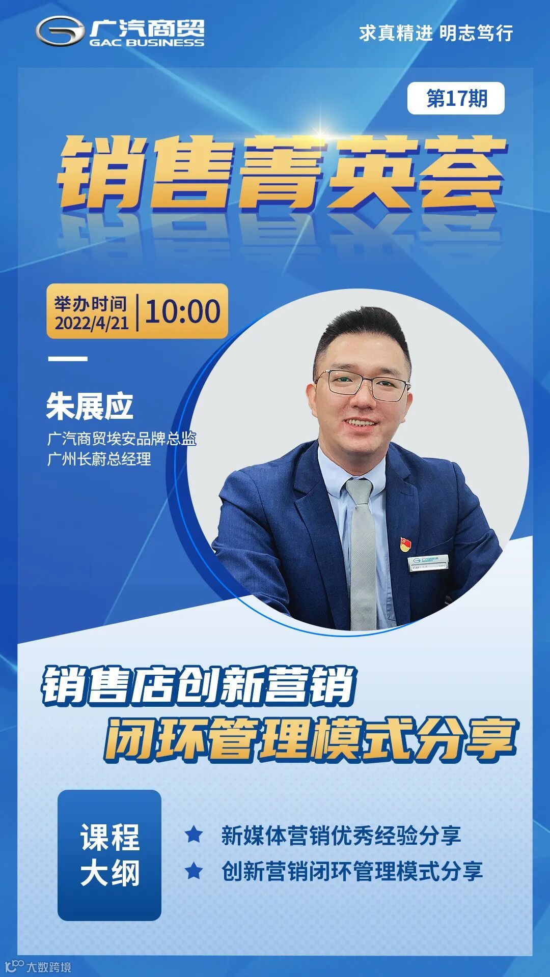 4月21日,第17期销售菁英荟如期举行,本次主题聚焦创新营销,邀请广汽商贸广汽埃安品牌总监、广州长蔚总经理朱展应线上开讲。广汽商贸全国销售店齐聚“云端”,共享广州长蔚创新营销经验成果。