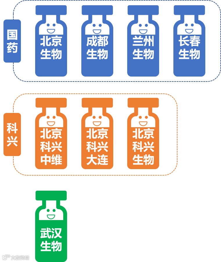 1. 国药:北京生物、成都生物、兰州生物、长春生物。