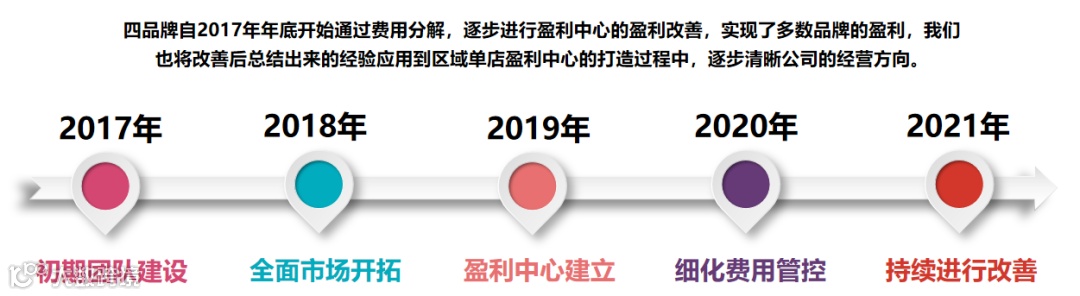 通过建立盈利中心,寻找盈亏平衡点,公司的盈亏平衡点是经营班子必须清晰掌握的界限,并针对盈亏平衡点采取相应措施。每月初对公司费用进行品牌、业务板块、盈利中心的分解,根据费用测算品牌两大盈利中心的毛利从而衡定盈利中心的经营能力,公司对盈利中心的达成情况设定绩效激励,各部门以合伙人的身份参与经营共谋发展。