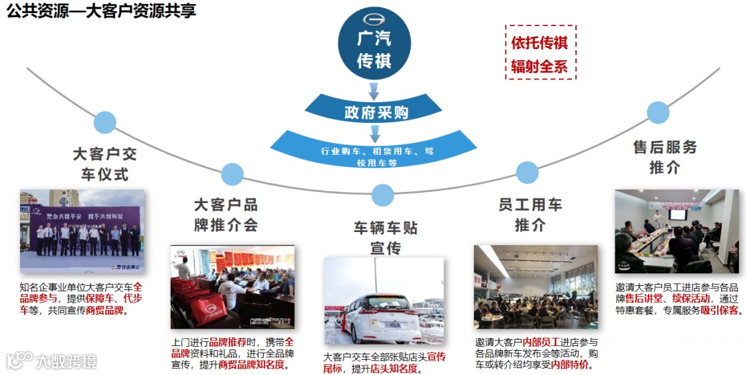 结合广汽商贸降本增效要求,整合不同品牌间的资源,促进店内共享。一是市场资源共享(降本),二是增值业务资源共享(增效),三是大客户资源共享。
