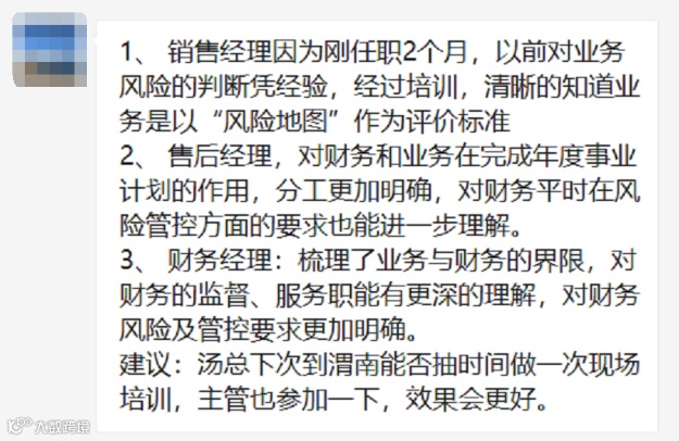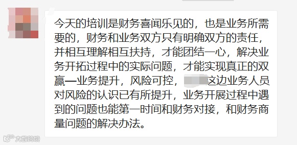此次培训让各业务部门了解财务风险管理与经营管理现状、距离和管理目标;