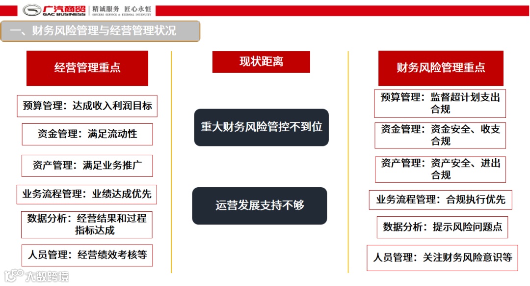 为了增加业务人员的财务意识,加强财务风险管控和支持运营发展,广汽商贸财务部组织开展业+财的困境与融合系列专题培训,并计划在各区域内逐步开展宣贯。