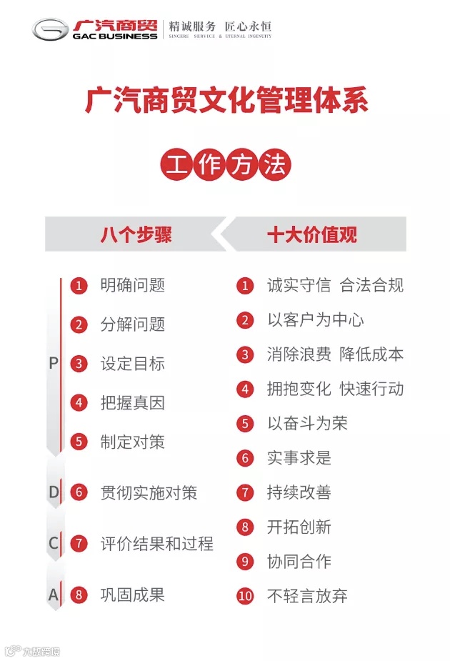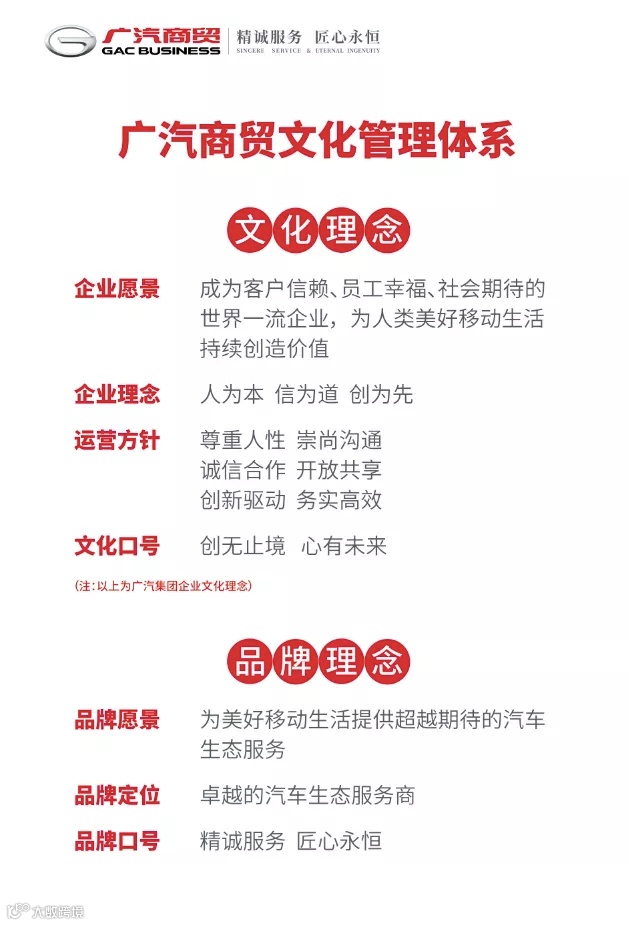 企业文化是企业持续发展的动力源泉,是企业的灵魂所在。2021年1月14日公司正式发布广汽商贸工作方法,至此,广汽商贸文化管理体系涵盖文化理念、品牌理念和工作方法三个部分。