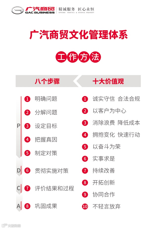 2021年1月14日公司发布广汽商贸工作方法,包括“八个步骤”和“十大价值观”。至此,广汽商贸文化管理体系包括文化理念、品牌理念和工作方法三个部分。与此同时,广汽商贸学院联合人力资源部围绕文化管理体系同步开发了《广汽商贸文化理念与品牌理念》《广汽商贸十大价值观》《PDCA问题解决八个步骤》《PDCA-A3资料制作技巧》等四门课程,并逐步推进各课程内训师的培养与认证。