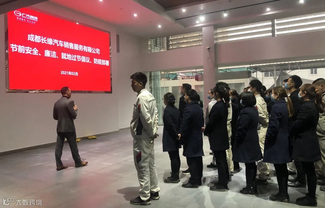 2月9日,成都长缘召开全体干部职工大会,部署节日期间安全、廉洁过春节及疫情防控有关工作,会议传达学习《广汽商贸有限公司贯彻落实八项规定精神实施办法》、《致广汽商贸四川省投资企业员工就地过年的倡议书》、《春节期间安全、廉洁、防疫工作部署》精神,对相关工作提出具体要求,确保全体职工过一个清正廉洁、安全祥和的春节。