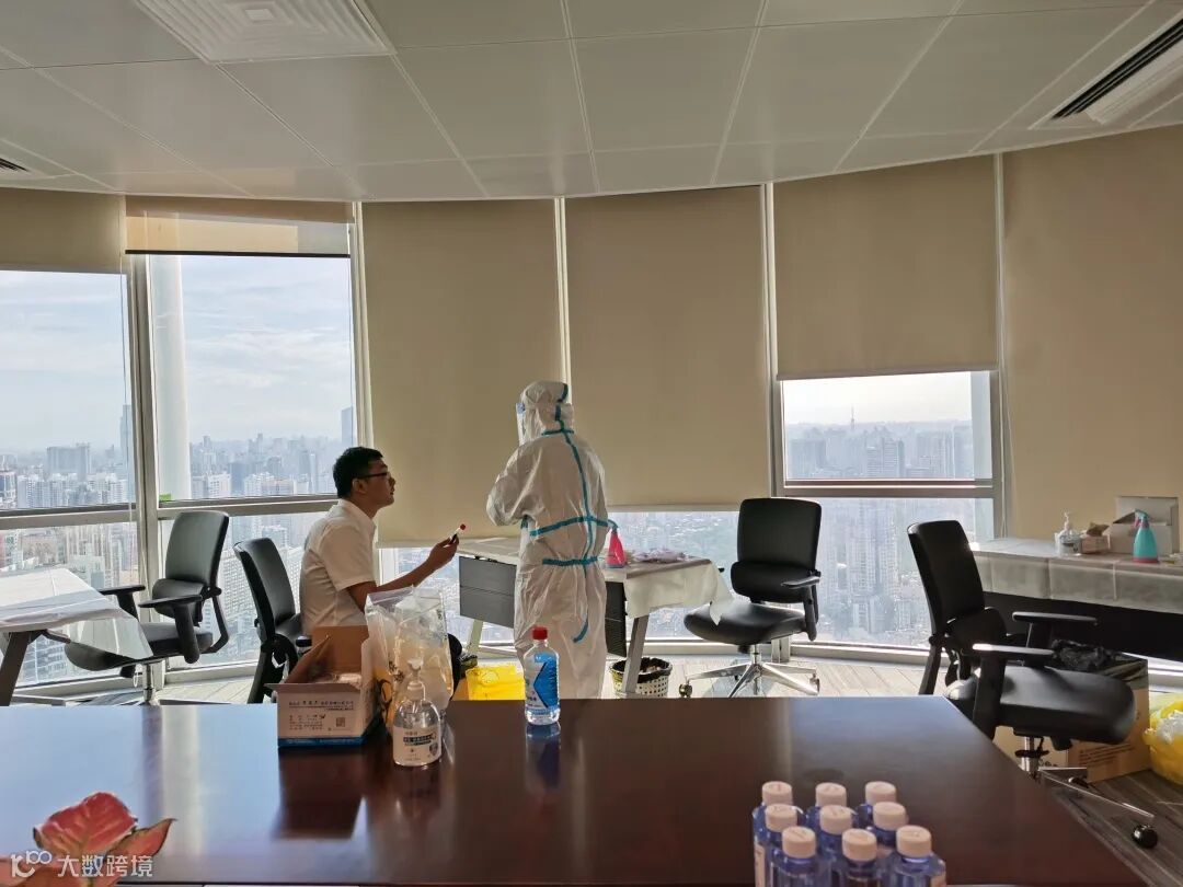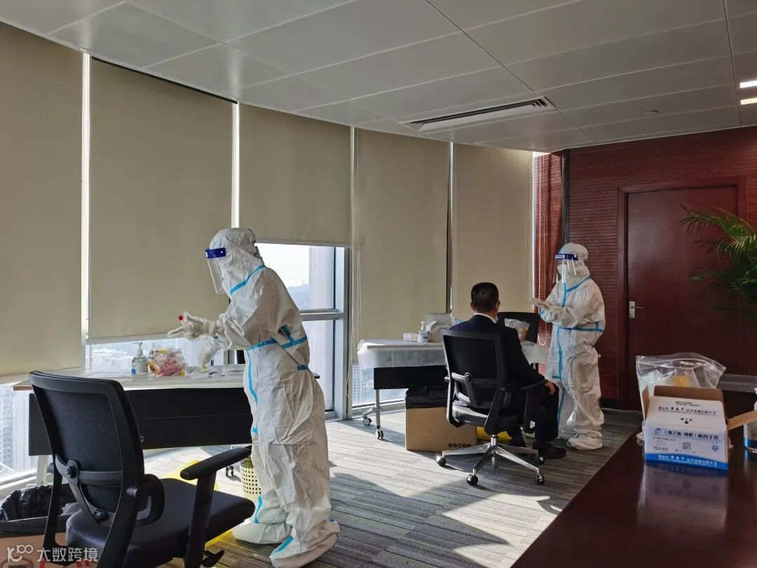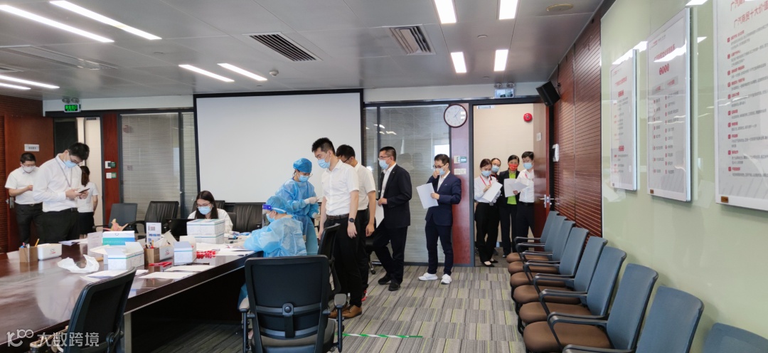 下午四点,公司在本部39楼会议室分别设置检测点,员工接到通知后,佩戴好口罩先后有序进入相关区域等候。