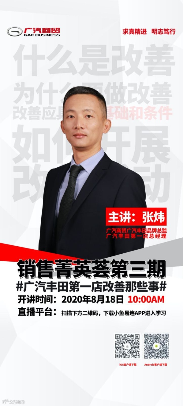 8月18日上午,广汽商贸学院第3期“销售菁英荟”现场直播,由广汽商贸广丰品牌总监、广汽商贸广丰一店总经理张炜主讲“广丰一店改善那些事”。广汽商贸旗下约100家销售店的中层及以上管理人员通过视频会议形式观看。