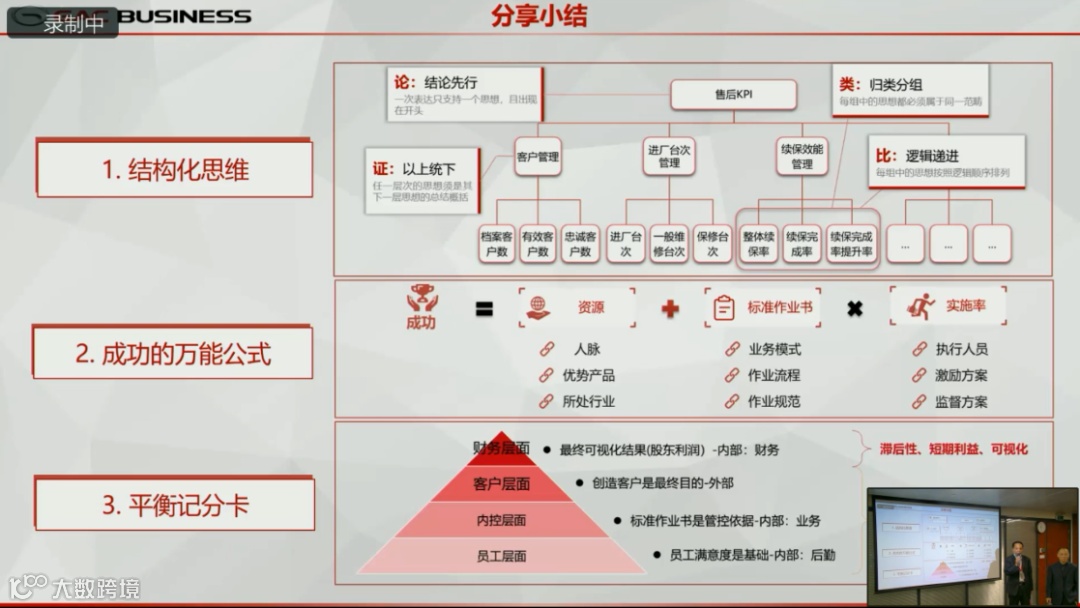 在存量市场环境中,销售店自身的运营能力与效率直接影响运营成果,广汽商贸的销售店遍布全国,由于地域、当地经济、品牌、客户群体的差异,各店的管理面临着一系列挑战。如何运用相对通用的工具或方法论进行统筹管理整个销售店是每一位销售店管理者的必修课题。针对此课题,黄永江首先分享了管理者需要的结构化思维以及成功的公式:成功=资源+标准作业书*实施率,传达了管理者要有结构化的思维模式以及行动方针;随后黄永江对管理工具平衡计分卡进行了介绍以及讲解了大量的实际运用案例,为上述问题提供了极富价值的解决之道。
