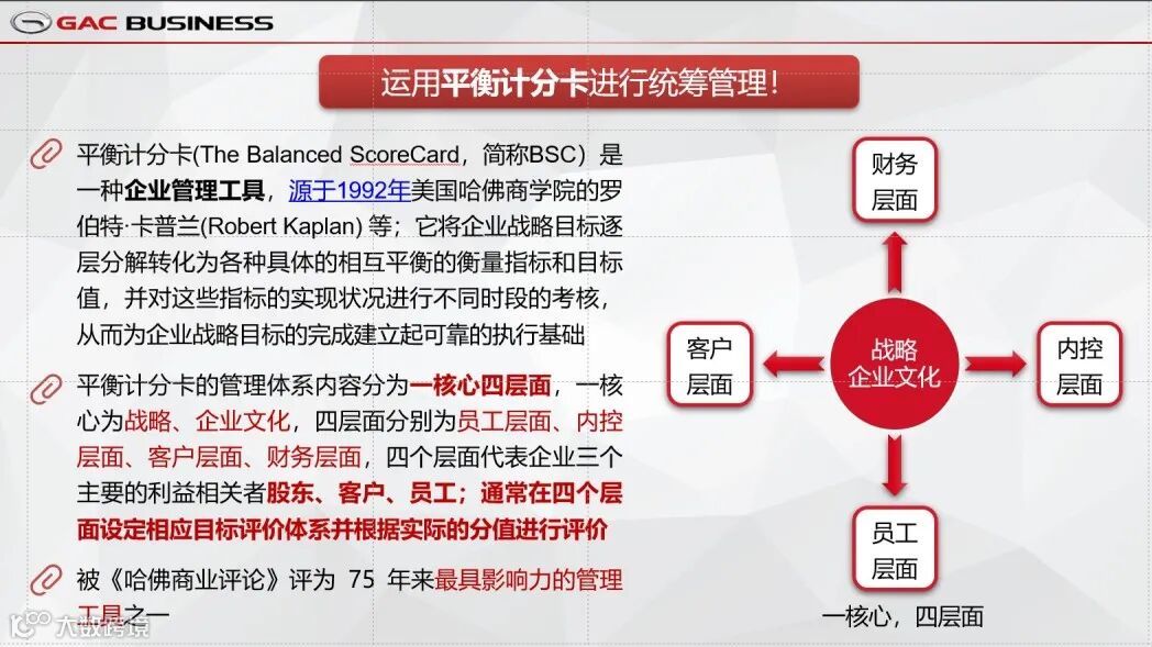 在平衡计分卡的介绍中,黄永江提出,平衡计分卡不应该只作为员工绩效考核的工具,而是作为整个销售店的评价、管控工具,其管理体系内容分为一核心四层面,四个层面代表企业三个主要的利益相关者股东、客户、员工。