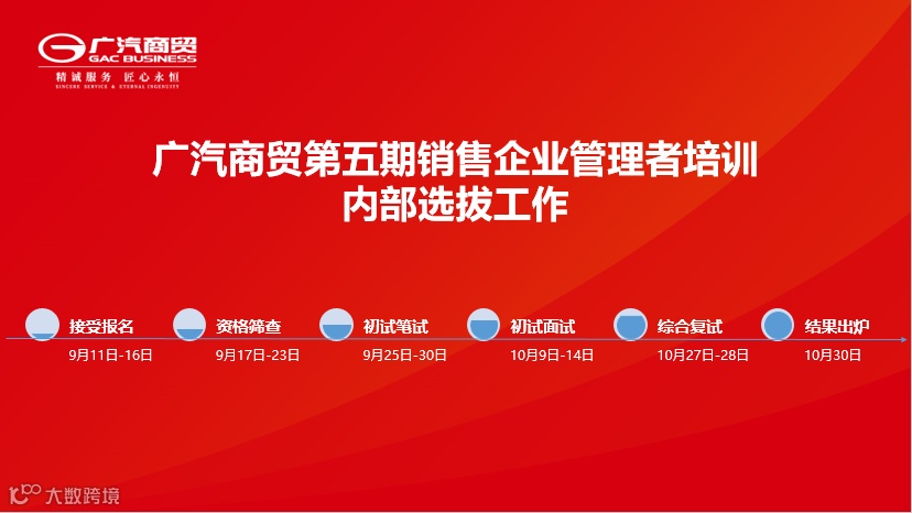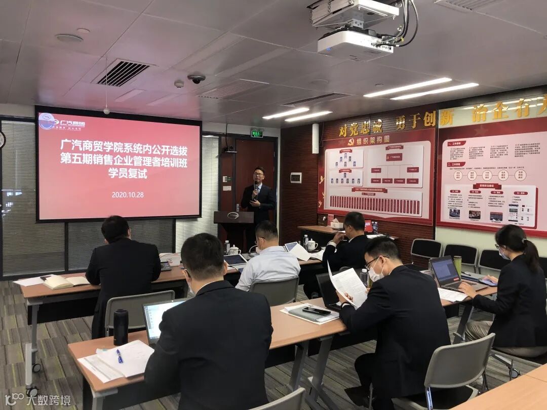 根据公司战略发展需求,为进一步拓宽选人用人渠道,为有能力、肯努力的优秀年轻人才搭建职业发展平台,2020年9月至10月,广汽商贸党委组织开展了广汽商贸第五期销售企业管理者培训内部选拔。经资格审查、初试笔试、初试面试和综合复试四个阶段,最终6名来自不同领域的人员脱颖而出,成功入选广汽商贸第五期销售企业管理者培训班。