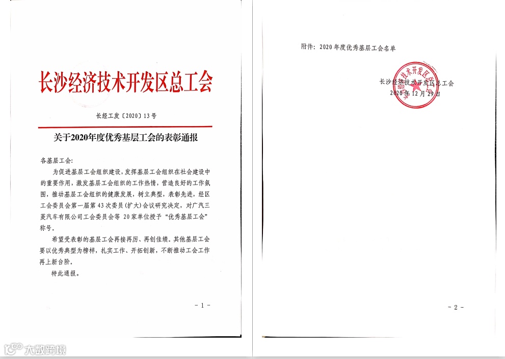 12月29日,广汽商贸日邮工会荣获长沙经开区2020年度优秀基层工会并获评2020年度考核一等绩效,“解决职工子女入园问题、助力企业健康持续发展”工作项目荣获2020年度经开区基层工会创新工作项目典型案例奖。