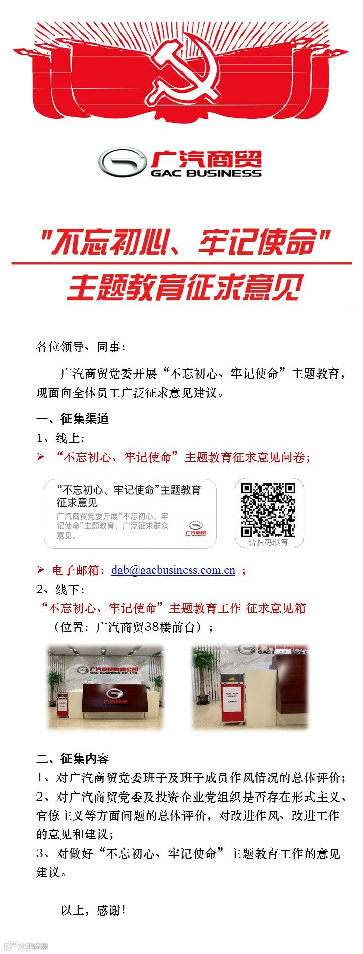 导读:广汽商贸党委开展“不忘初心、牢记使命”主题教育,广泛征求群众意见。