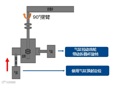 制作齿轮齿条装置(称为折叠杆),利用气缸顶起定位,让齿轮带动折叠杆完成板尾折叠;并模仿人工压板的动作,设置了压板装置,压平板尾折叠处的隆起,取代人员进入设备折叠、踩压板尾的作业。