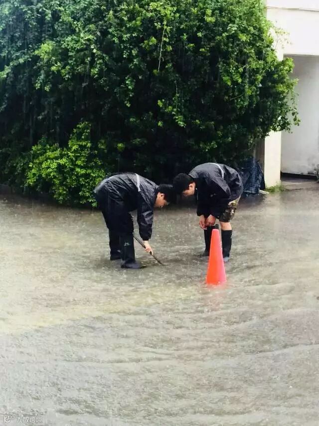 长悦的同事冒着风雨,排除险情
