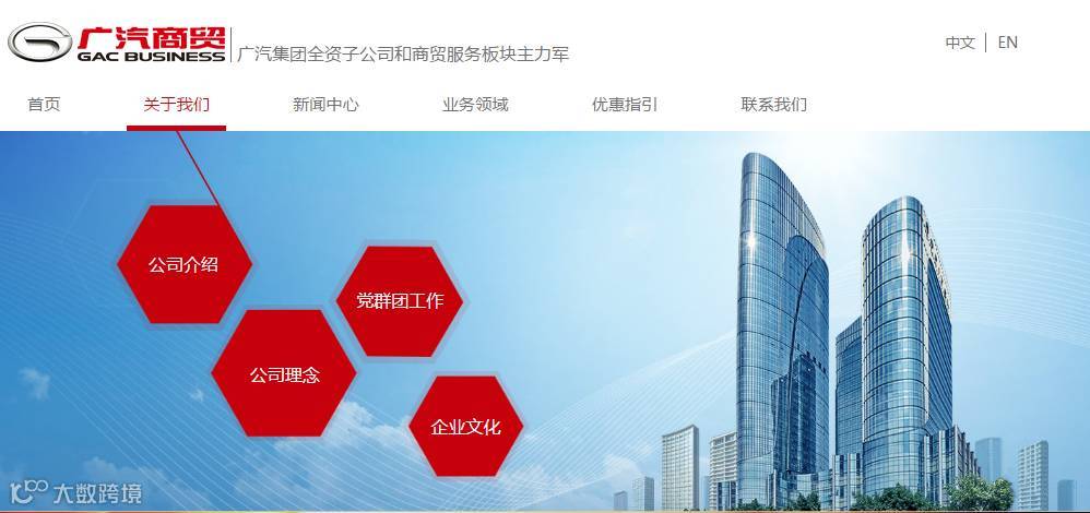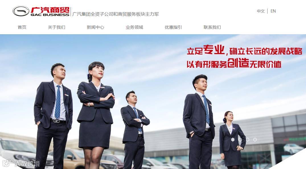 结构上,内容布局层次清晰,分为【关于我们】【新闻中心】【业务领域】【优惠指引】【联系我们】等五大板块,在突出广汽商贸的形象高度的同时,彰显了广汽商贸的整体实力。