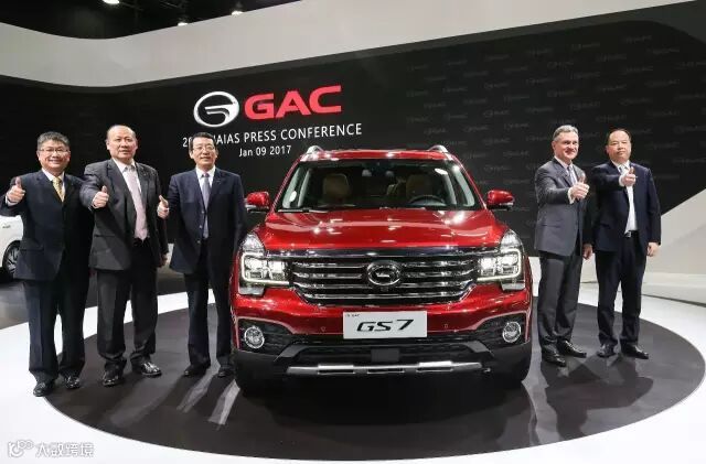 北美车展组委会执行主席罗德·艾伯茨,广汽集团总经理冯兴亚、副总经理张青松,广汽研究院院长王秋景及广汽乘用车总经理郁俊与广汽传祺GS7合影