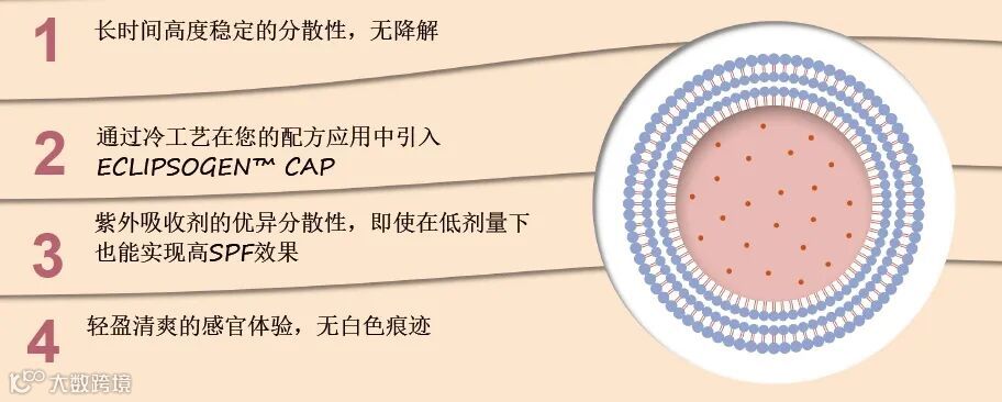 ☑ Eclipsogen™ CAP创造超薄、均匀的覆盖,实现最佳防护,零渗透,温和性极高, 特别适合敏感肌肤防晒产品使用。