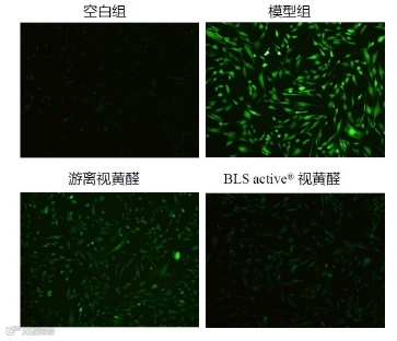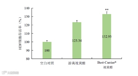 经游离视黄醛和Best-Carrier® 视黄醛作用后胞内ROS荧光强度显著降低,与游离视黄醛比较,Best-Carrier® 视黄醛可显著降低HDF细胞胞内ROS水平(P<0.01),抵抗氧化应激造成的损伤,效果明显优于同剂量游离视黄醛。