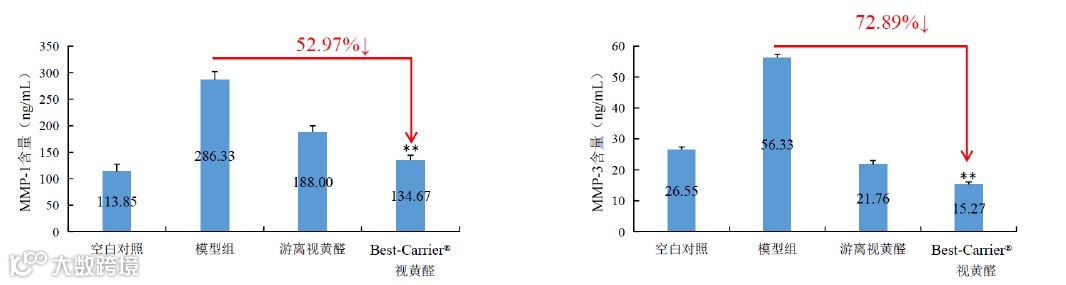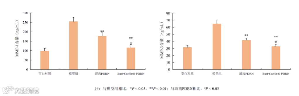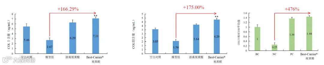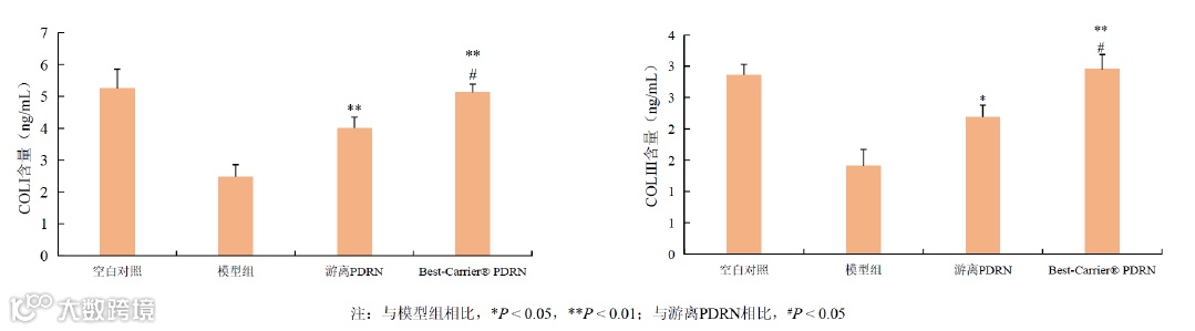 HDF细胞经UVA诱导后细胞胶原蛋白含量显著下降。与游离PDRN比较,Best-Carrier® PDRN 分泌COLⅠ和COLⅢ水平显著升高(P < 0.01)。表明Best-Carrier® PDRN 通过载体包载,可显著促进COLⅠ和COLⅢ的分泌,效果明显优于同剂量游离PDRN。