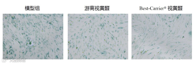 β-半乳糖苷酶染色显示,Best-Carrier® 视黄醛对HDF衰老细胞具有明显的减缓衰老作用,且优于同剂量的游离视黄醛。