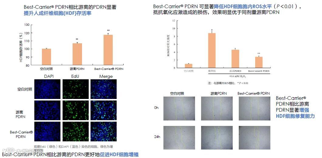 ✅强!细胞实验数据显示,与普通PDRN相比,Best-Carrier® PDRN 在促进细胞增殖、修复损伤、刺激胶原生成和抗光老化方面的功效显著提升▼
