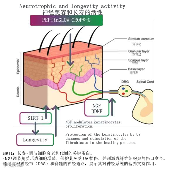 PEPTinGLOW CROP®-G 具有神经美容和长寿的活性: 上调SIRT1长寿基因的表达,上调NGF表达。