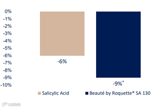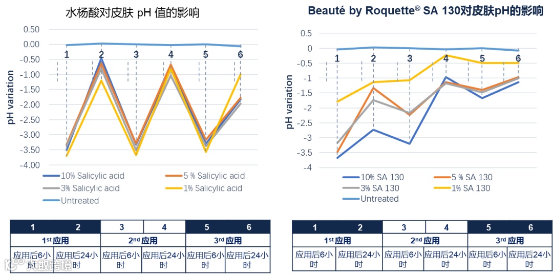 测试表明:SA 130不会大幅度地降低皮肤的pH值,仅需两天建立pH耐受,而无须像水杨酸每次使用时均会引起皮肤pH强烈波动。因此使用琥珀酸将更有助于维持健康的皮肤或恢复皮肤的 pH 平衡,对皮肤更加友好。