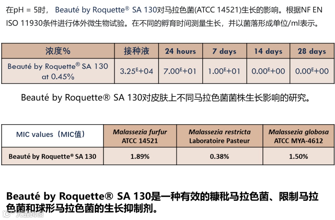 在相同的配方中测试2%的Beauté by Roquette® SA 130和6%的Beauté by Roquette® PO 500 ,并与1%的吡硫翁锌(ZPT)和1%的吡罗克酮乙醇胺盐(OCT)进行比较。