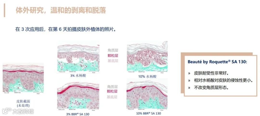 促进角质层自然剥脱 “非脱皮性脱屑” 不伤害颗粒层以下的活性表皮,与水杨酸不同,水杨酸针对桥粒蛋白,存在于表皮各层,对整个表皮降解破坏性强。