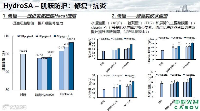 HydroSA可显著提升皮肤中丝聚蛋白、Claudin-1、AQP3和透明质酸的含量,修复受损角质屏障,保护肌肤锁水力。