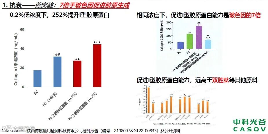 ▶燕窝酸在促进I型胶原蛋白生成方面的能力是玻色因的7倍,显著提升肌肤的紧致度和弹性。