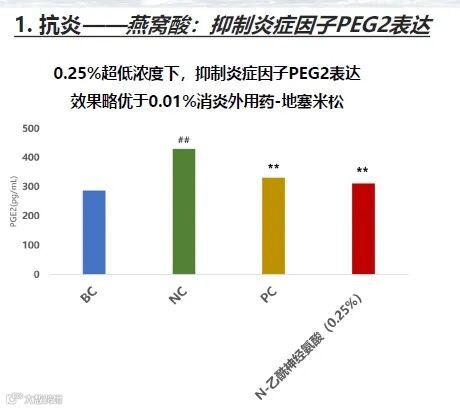 ▶燕窝酸能有效抑制炎症因子PEG2的表达,其抗炎效果在低浓度下即可显现,0.25%超低浓度下,效果甚至略优于0.01%消炎外用药—地塞米松。