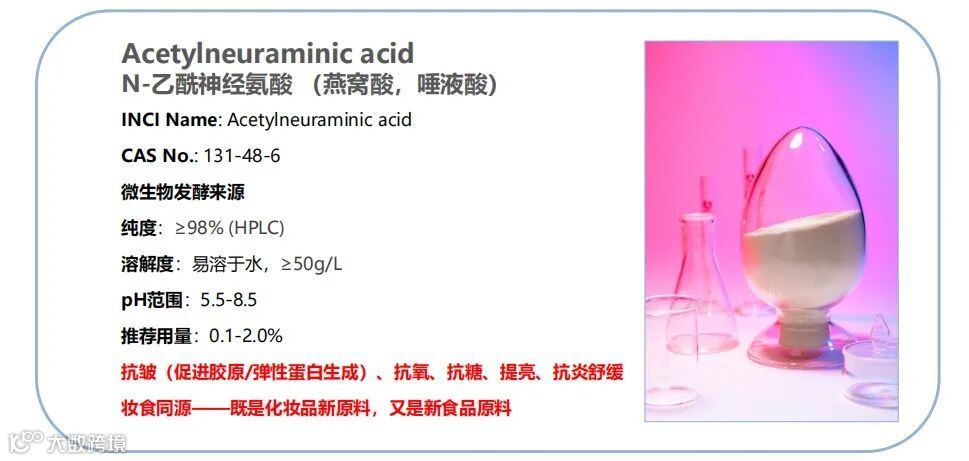 N-乙酰神经氨酸(燕窝酸)-人体内源性抗衰老成分,是细胞膜上糖蛋白的关键组分,是细胞层面信息传导过程中的重要载体,俗称“细胞天线”。