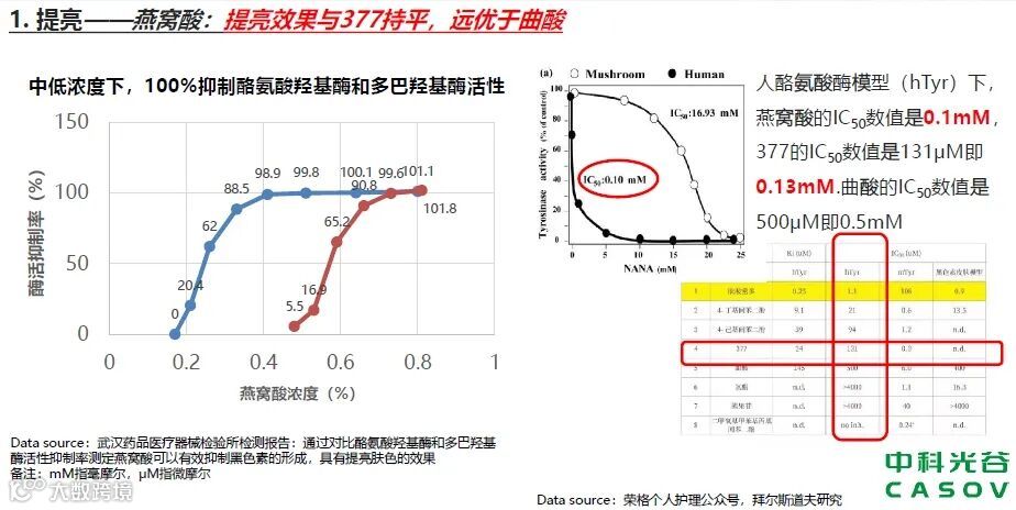 ▶在提亮肤色方面,燕窝酸的效果与377成分持平,远优于曲酸,能有效抑制黑色素的形成,使肌肤更加明亮均匀。
