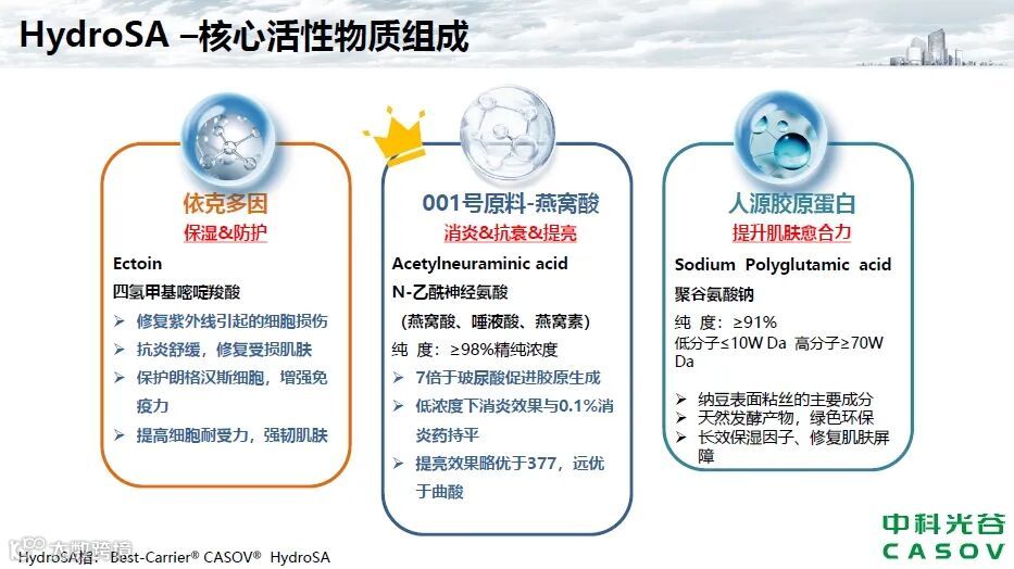 •HydroSA主要功效成分为燕窝酸、依克多因和人源胶原蛋白。