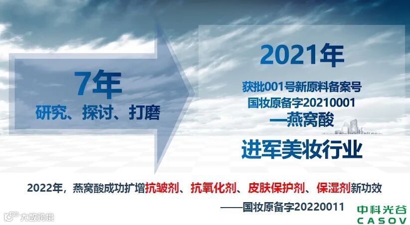 中科光谷7年砥砺打磨,2021年获得001新原料备案号,成为首个完成备案的新原料,开创中国成分创新序幕。