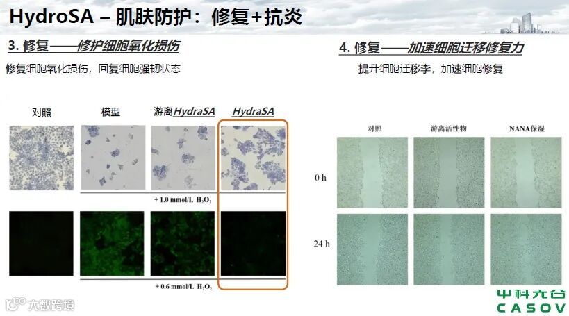 HydroSA还具有促进表皮细胞Hacat增殖,并加速细胞迁移修复力,修护细胞氧化损伤以及紫外线以及可见光带来的肌肤损伤,提升肌肤热耐受能力等,实现皮肤的多效多靶点保湿修护,是敏感肌保湿修护的理想成分。