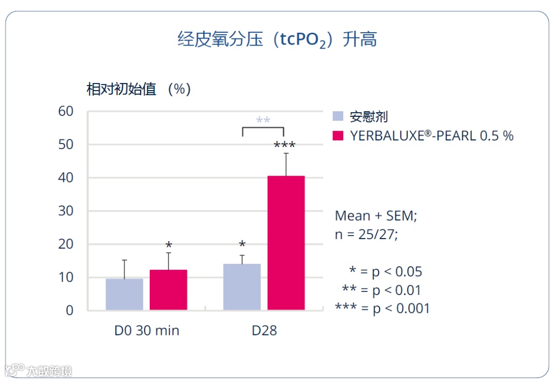 使用30 分钟后,经皮氧分压立即显著增加12%。28天后显著增加40.5%,显著高于安慰剂。