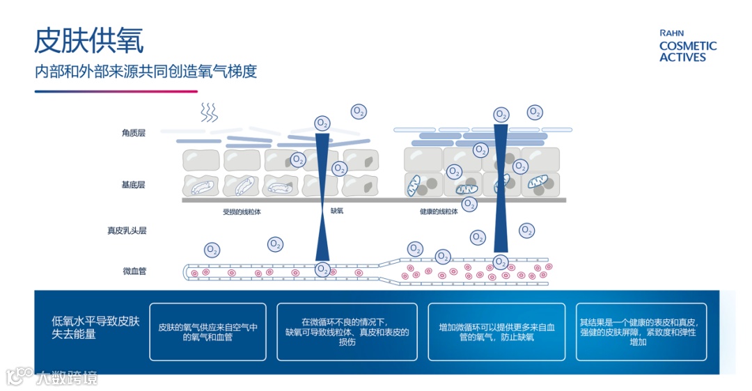 皮肤的氧气供应来自空气中的氧气和血管,而当在微循环不良的情况下,缺氧可导致线粒体、真皮和表皮的损伤,带来的皮肤表征包括:扰乱的皮肤屏障、皮肤水含量低、暗哑和下垂的皮肤、无活力光彩的肌肤。