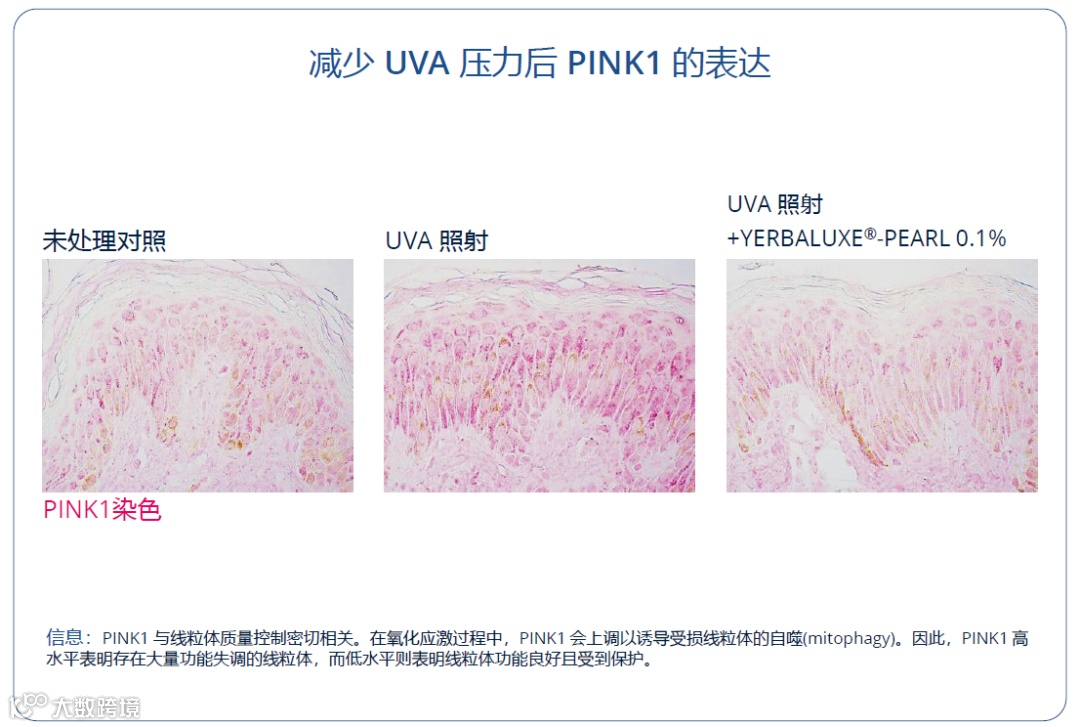 ▶结果显示:用0.1 % YERBALUXE® -PEARL 处理的皮肤外植体在UVA 照射后,PINK1 染色的增幅较小,表明线粒体功能保持健康状态。