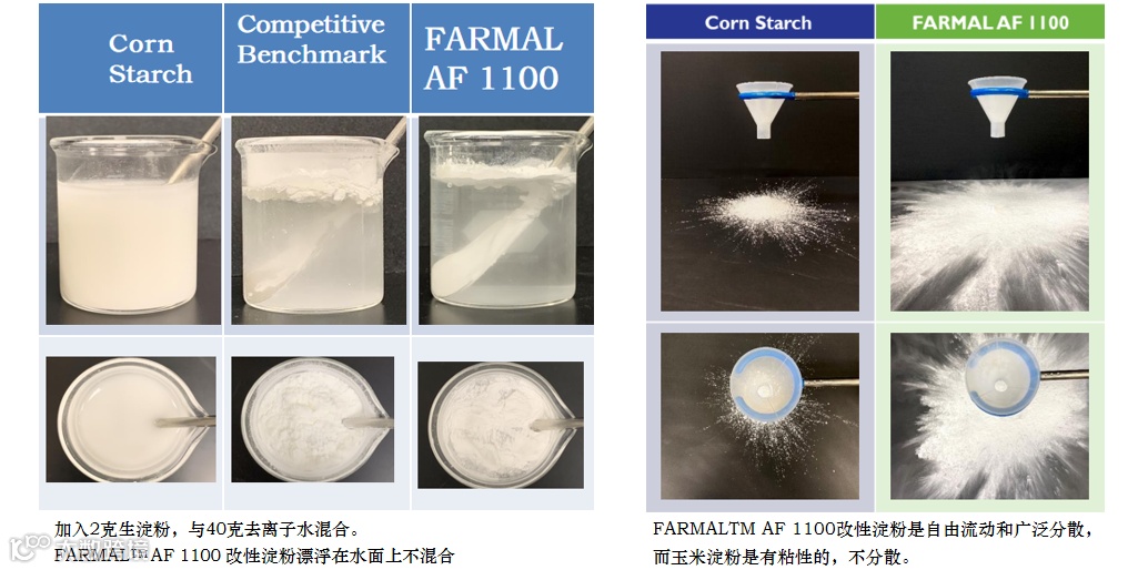 • FARMALTM AF 1100 改性淀粉的两亲性可以稳定配方中的UV活性,提高分散性和耐水性